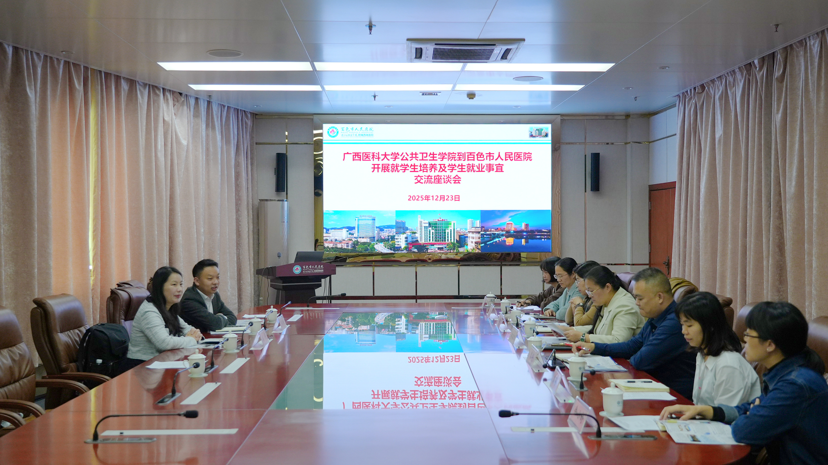 为精准对接用人单位需求,进一步提升人才培养与社会需要的契合度。12月23日,九色视频 院长苏莉一行4人赴百色市人民医院、百色市疾病预防控制中心开展“访企拓岗”专项活动,与用人单位负责人深度座谈交流。