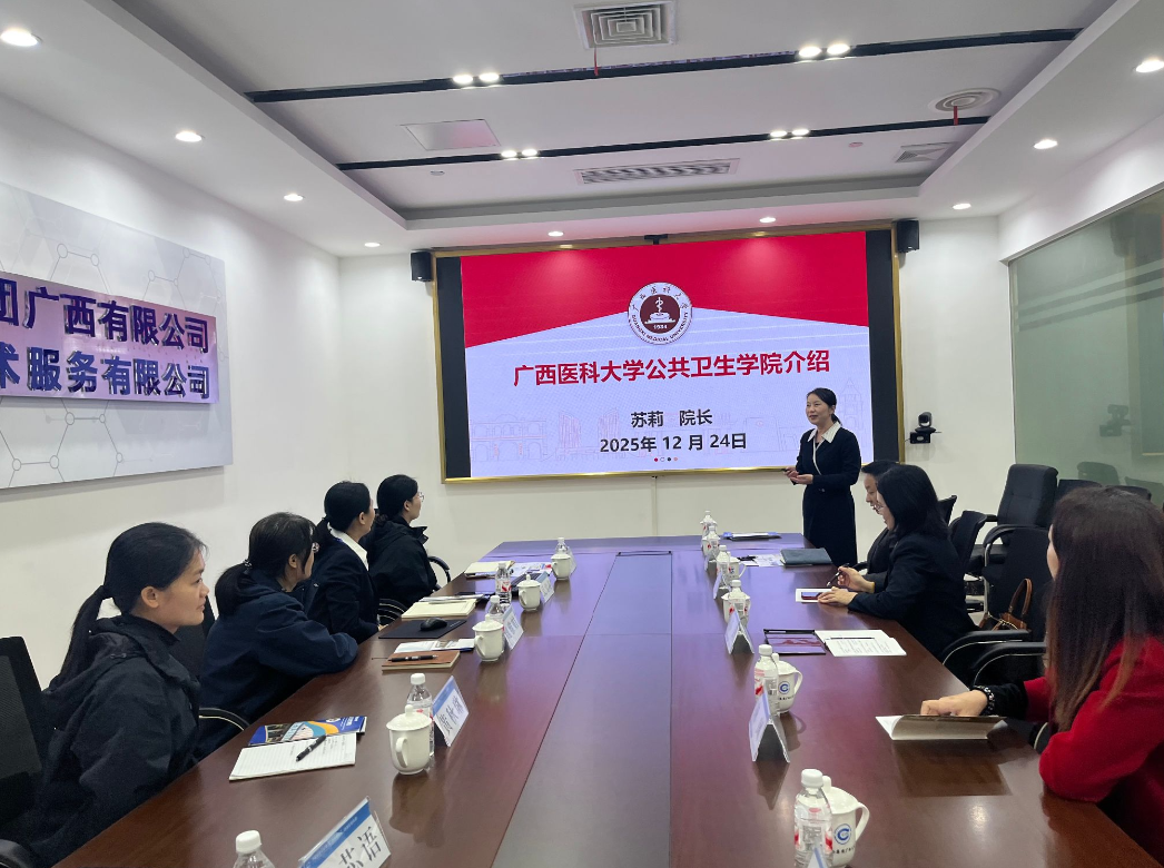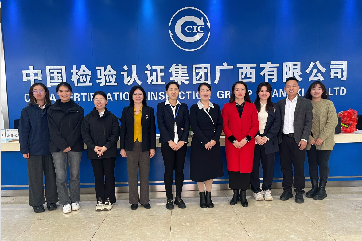 为精准对接企业人才需求,深化校企协同育人机制,12月24日下午,九色视频 院长苏莉、副书记唐凤、卫生检验与检疫学系主任黄东萍一行前往中国检验认证集团广西有限公司(简称“中检广西公司”)走访调研,与中检广西公司技术中心副主任魏雅娟、技术研发部主任吴雪英等人座谈交流。