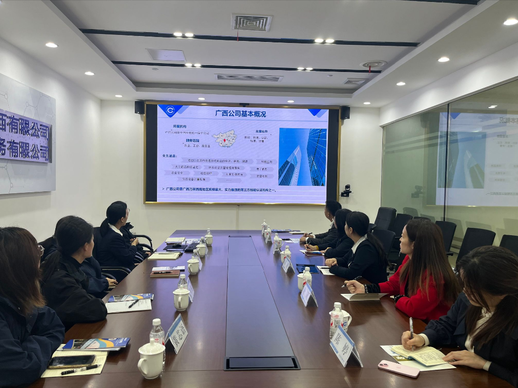 魏雅娟介绍了中检广西公司的业务领域、技术优势及实验室平台建设情况,重点解读企业用人标准与专业培养要求,明确表达实习实践基地共建意向,为后续提升毕业生就业适配度奠定基础。会后,调研团队实地参观了企业实验室科研平台。